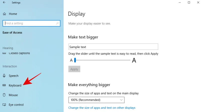 ในหน้า Ease of Acess เลื่อนลงมาด้านข้าง คลิกที่แถบ แป้นพิมพ์ (Keyboard)