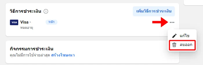 - จะต้องไม่มีแคมเปญโฆษณารันอยู่ ถ้าโฆษณายังทำงานอยู่ให้ปิดก่อนถึงจะสามารถลบข้อมูลบัตรออกได้