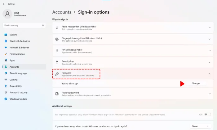 การยกเลิกรหัสผ่านใน Windows 11 ทำได้เฉพาะบัญชีเข้าใช้แบบ Local Account เท่านั้น ในกรณีวินโดวส์ได้เชื่อมโยงบัญชีผ่าน Microsoft จะไม่สามารถลบรหัสผ่านได้