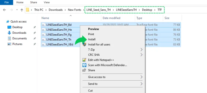 ซึ่งการติดตั้งในคอมพิวเตอร์ให้เข้าไปในโฟลเดอร์ LINESeedSansTH > Desktop > TTF ใช้เมาส์ลากคลุมไฟล์ทั้งหมดแล้ว คลิกขวา เลือก Install ติดตั้งฟอนต์