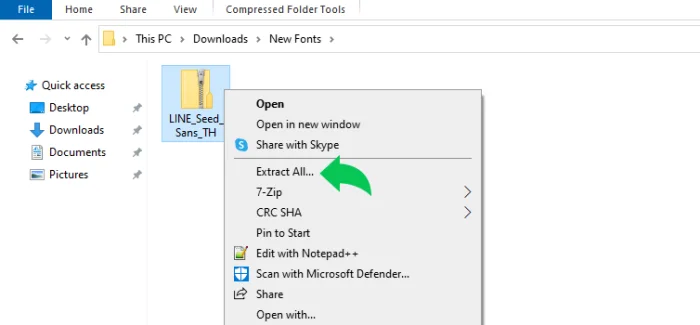 หลังจากดาวน์โหลดฟอนต์มาไว้ในอุปกรณ์ โดยไฟล์ชื่อ LINE_Seed_Sans_TH ให้คลิกขวาที่ไฟล์ เลือกเมนู Extract All… แตกไฟล์