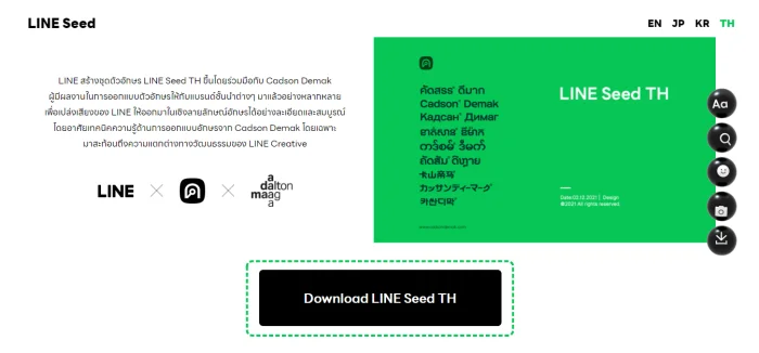 สำหรับฟอนต์ฟรีของ LINE ดาวน์โหลดได้ที่เว็บไซต์ https://seed.line.me เลือกเมนู TH ภาษาไทย มุมขวาบนของหน้าต่าง