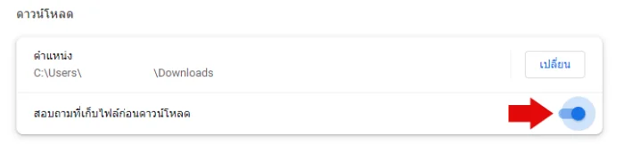 อย่างที่เกริ่นไว้ว่าเบราว์เซอร์ กูเกิล โครม มีฟังก์ชั่นให้ระบบถามผู้ใช้ก่อนดาวน์โหลดข้อมูลเก็บไว้ในโฟลเดอร์ ซึ่งการตั้งค่าง่ายมากให้ดูที่หัวข้อ สอบถามที่เก็บไฟล์ก่อนดาวน์โหลด (Ask where to save each file before downloading) ค่าเริ่มต้นจะปิดอยู่ให้สลับเพื่อเปิดใช้งานฟังก์ชั่น