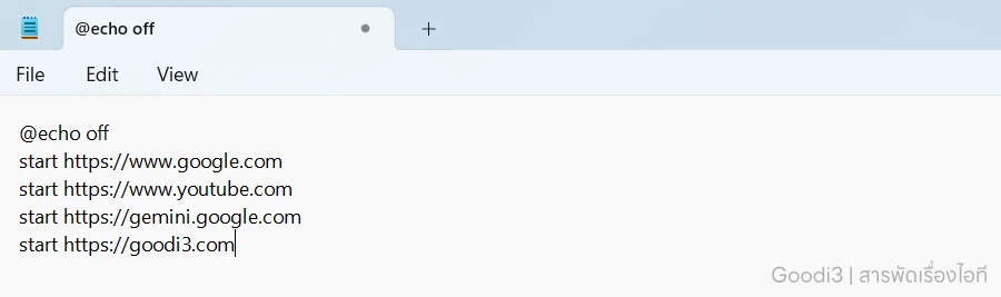โค้ดข้างต้นจะสั่งให้เปิดเว็บไซต์ทั้ง 4 เว็บพร้อมกันบนเบราว์เซอร์ หากต้องการเพิ่มเว็บก็แค่ขึ้นบรรทัดใหม่ด้วยคำสั่ง start ใส่ลิงก์ (url) ของเว็บปลายทาง