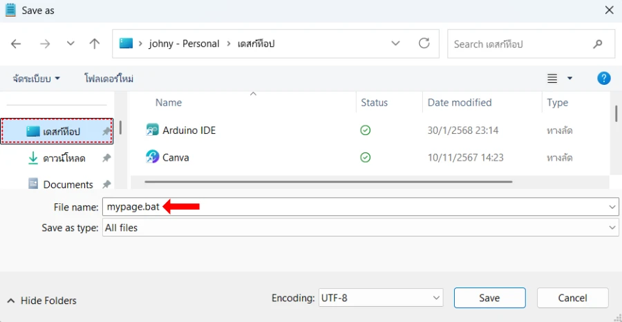 จากนั้นให้ทำการบันทึกตั้งชื่อไฟล์นามสกุล .bat ตัวอย่างเช่น mypage.bat ให้บันทึกไว้ที่หน้าจอ Desktop ไฟล์ที่ได้จะมีหน้าตาเป็นรูปเฟืองสามารถปรับแต่งเปลี่ยนเป็นไอคอนรูปอื่นได้